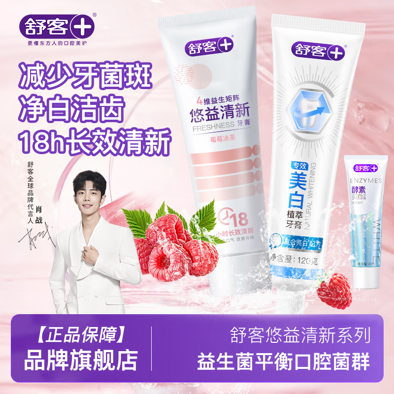 舒客益生菌牙膏家庭实惠装洁白牙齿清新口气减少细菌牙菌斑牙渍 莓莓冰茶120g+美白植萃120g+小样20g
