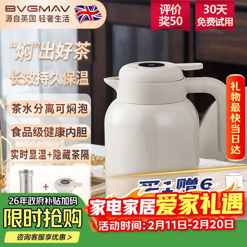 宝威玛(BVGMAV)保温壶家用大容量316L不锈钢内胆暖水瓶高档居家办公按压热水壶 淡雅杏【升级款温显+独立茶隔焖茶】1.6L