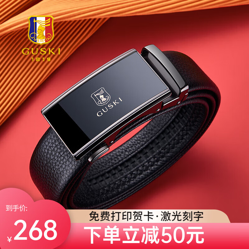 古士旗(GUSKI)法国品牌皮带男真皮自动扣男士裤腰带高档生日礼物送男友老公 枪扣简约款+头层牛皮【专柜礼盒】 115cm -130cm随机联系客服指定