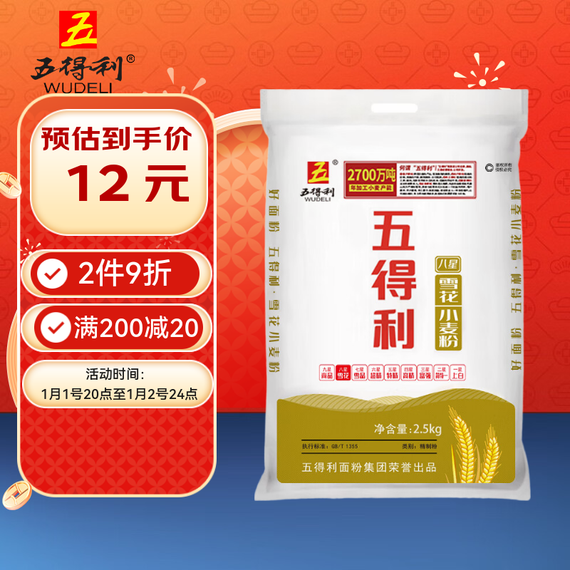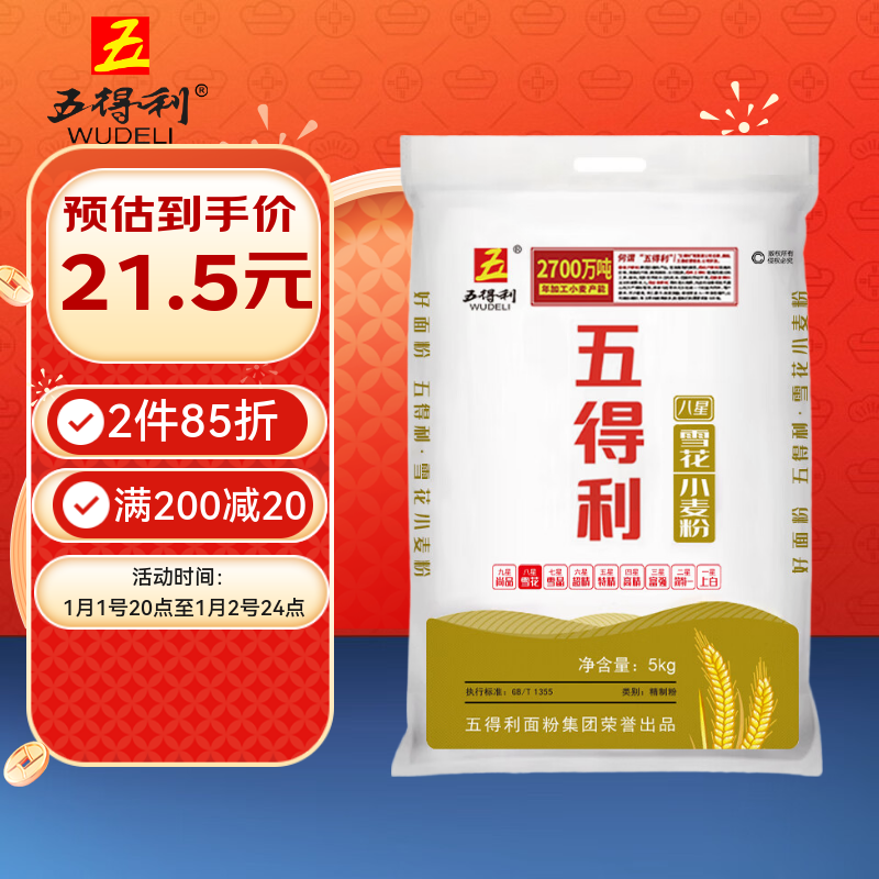 五得利面粉 八星雪花小麦粉包子面条水饺麦芯粉5斤