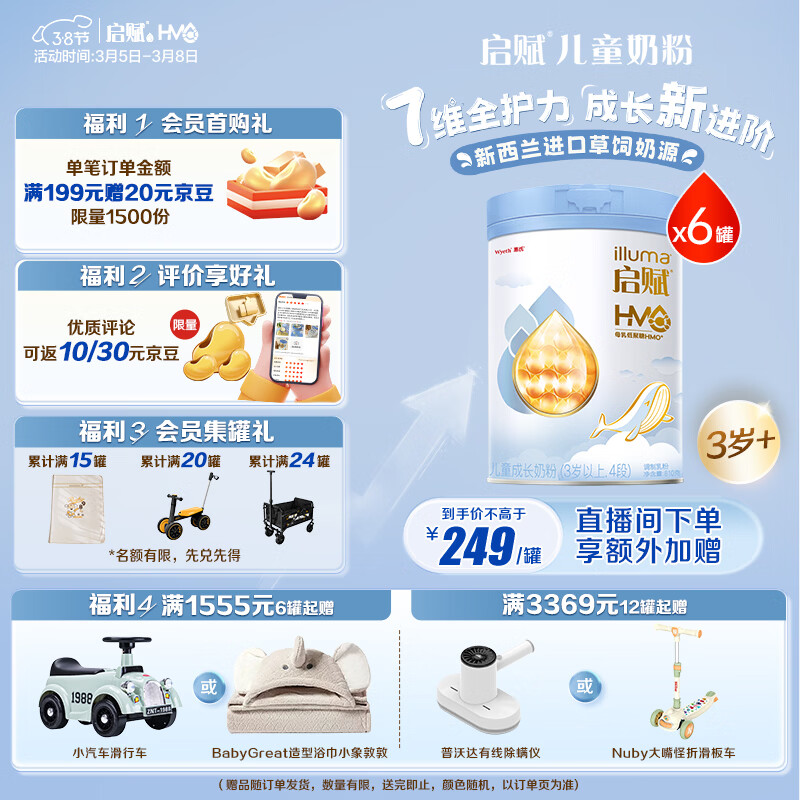 惠氏(Wyeth)启赋蓝钻2HMO增强自御力DHA儿童成长奶粉4段(3岁以上)810g*6