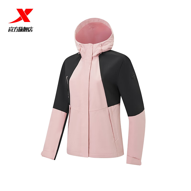 特步运动风衣女款2025秋季新款双层连帽保暖撞色外套975328160059 正黑色/铁粉色 3XL