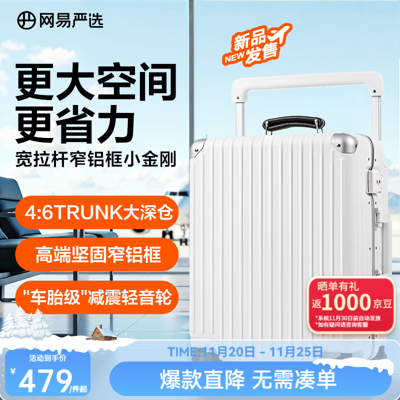 网易严选宽拉杆窄铝框小金刚PC行李箱大容量TRUNK旅行箱密码箱拉杆箱出差 优雅白 20英寸