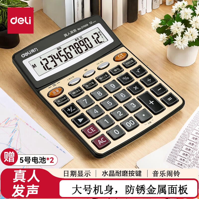得力(deli)大屏金色面板语音计算器 学生/财务办公 12位显示真人语音计算机 办公文具用品 大号 27559