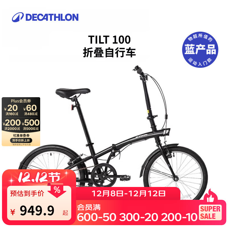 迪卡侬TILT100折叠车20寸男女轻便便携城市通勤上班轻量单车OVB1 黑色 20英寸