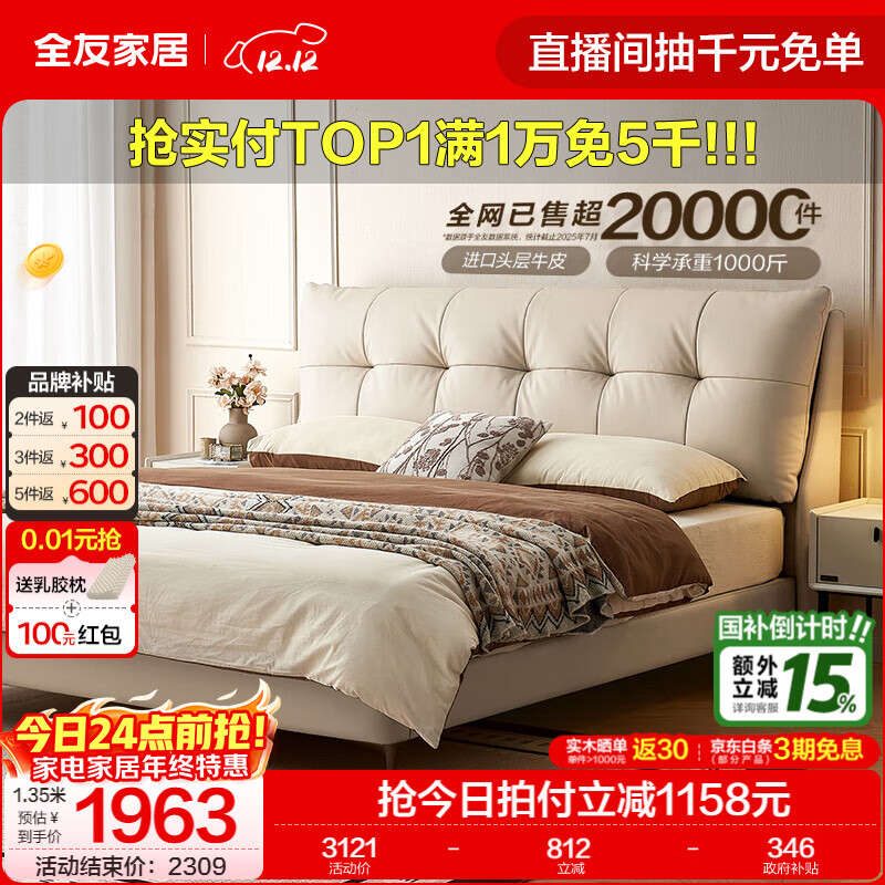 全友家居奶油风真皮软包高箱繁星储物床1.8米x2米主卧室双人大床家具 【高脚 | 米色 | 牛皮】床 1.8x2米