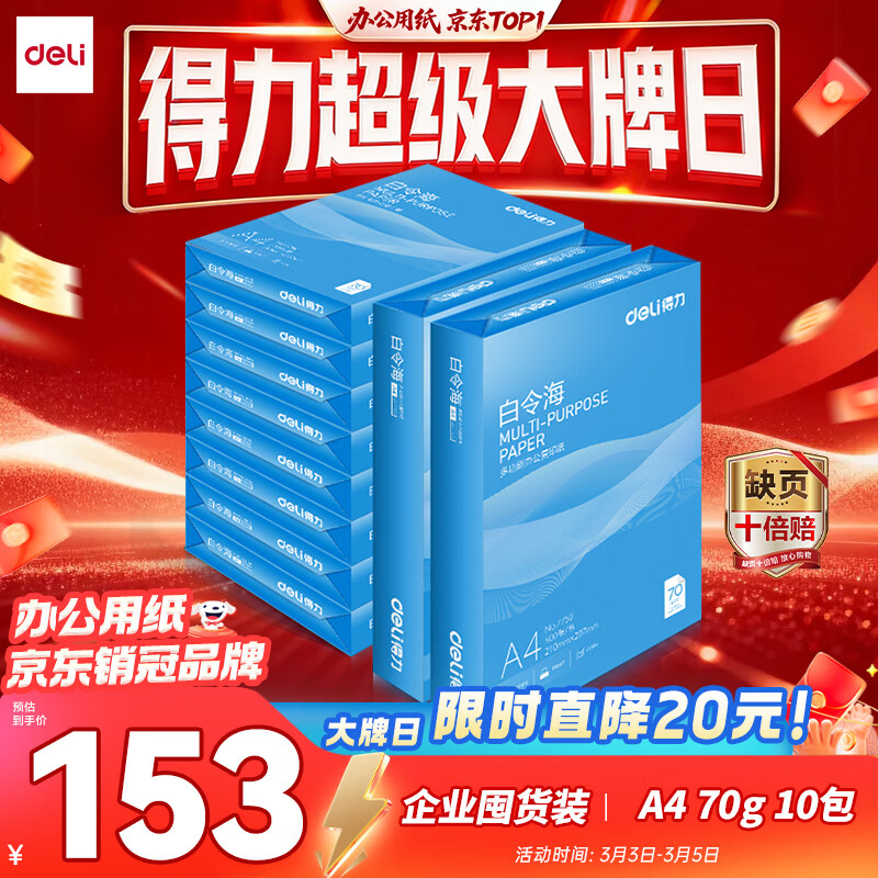 得力(deli)白令海A4打印纸 70g500张*10包一箱 双面高性价比复印纸 整箱5000张 7755【经济热销】