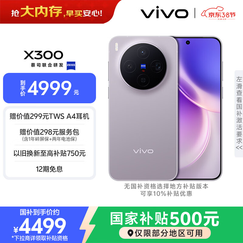 vivo X300 12GB+512GB 惬意紫 蔡司2亿超级主摄 蔡司APO超级长焦 5年持久流畅OriginOS 6 拍照 AI手机