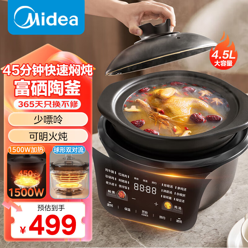 美的(Midea)电炖锅焖炖煲 快炖电砂锅电炖盅炖汤盅紫砂燕窝煲汤锅电煮锅煮粥锅 预约保温天然紫砂锅多功能锅 4.5L 【全能焖炖】提升50%丨富硒陶釜