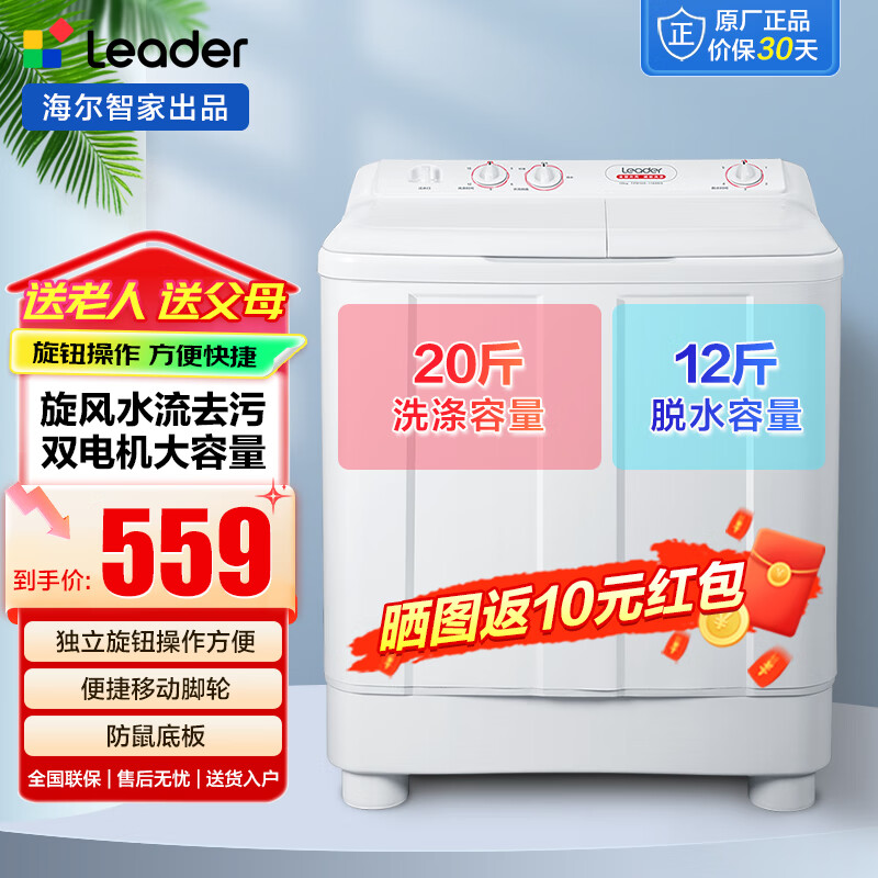 海尔洗衣机半自动12/10公斤大容量家用双桶水电分离移动脚轮自由安放防鼠底台安全耐用双缸 海尔智家Leader10GK旋风水流+独立旋钮