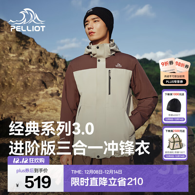 伯希和(Pelliot)【经典3.0山野】冲锋衣三合一男女新款秋冬防风防水登山保暖外套 【男款】烟灰卡其+乌木棕 | 两件套 M
