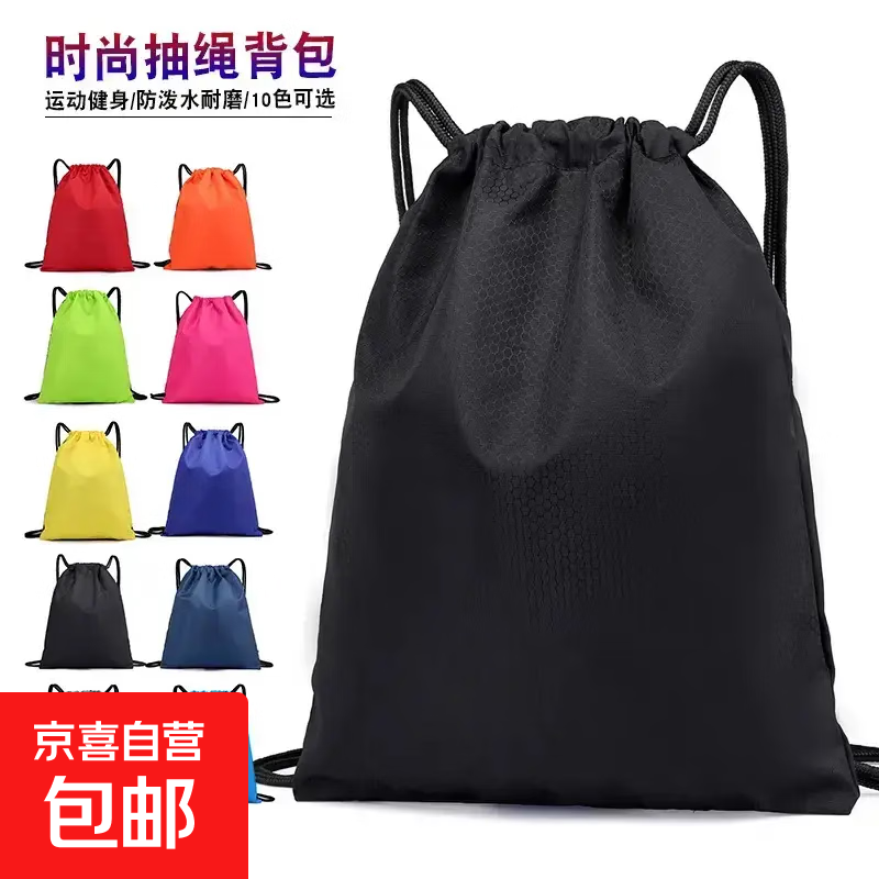 防水游泳包束口袋抽绳双肩包轻便折叠小背包马拉松运动便携简约款 超大容量-黑色 轻便折叠