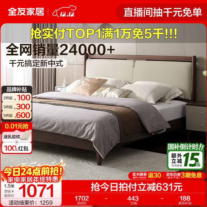 全友家居新中式家具主卧室实木高脚床双人大床高箱床软包床款 【高脚款】单床 1.8x2米【软靠床屏+实木脚】
