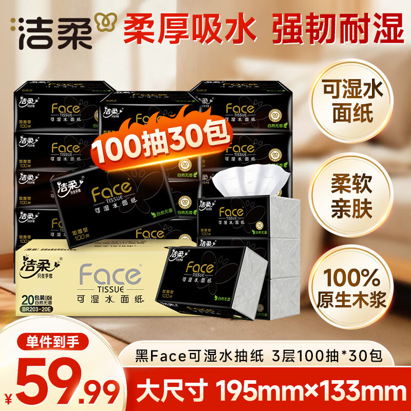 洁柔抽纸 黑Face可湿水3层100抽*30包 面巾纸 厚实 干湿两用纸巾 整箱