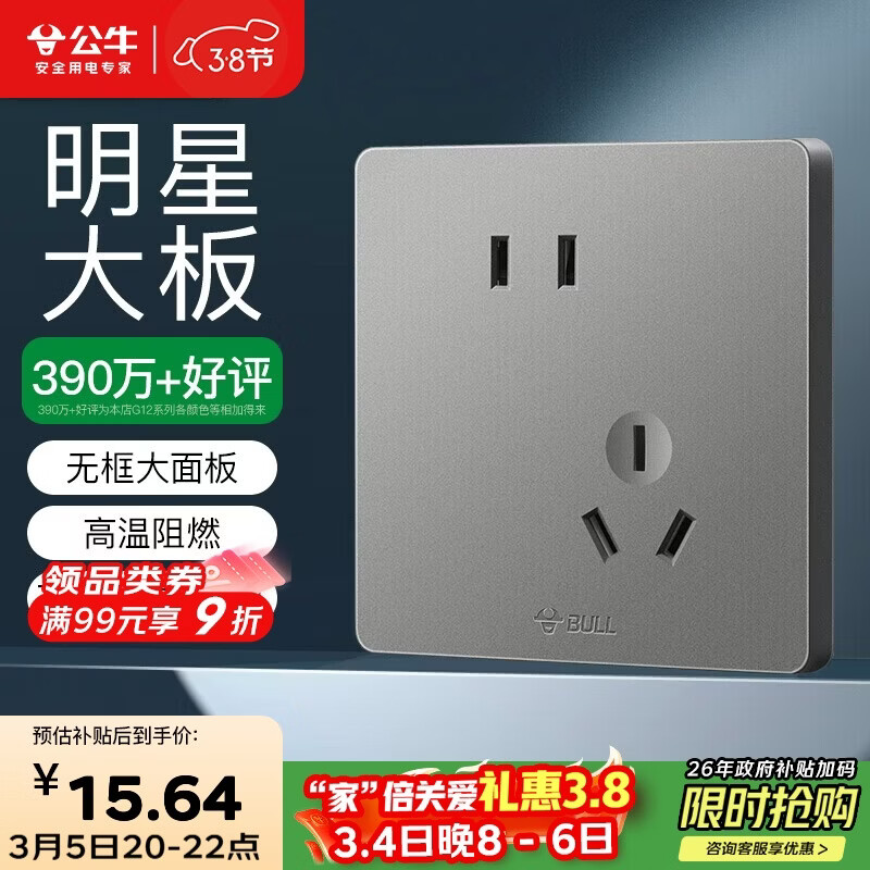 公牛(BULL)开关插座 G12系列 10A斜五孔插座86型插座面板 G12Z223AS 星空灰