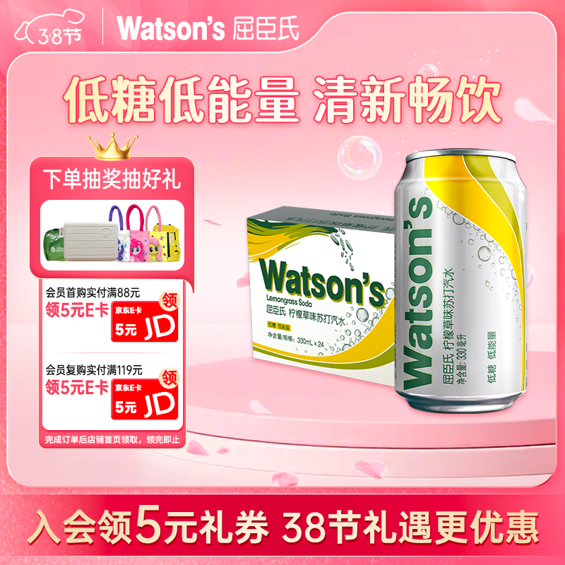 屈臣氏(Watsons)苏打水柠檬草味含汽气泡水饮料0脂低糖解腻调酒330mL*24罐整箱