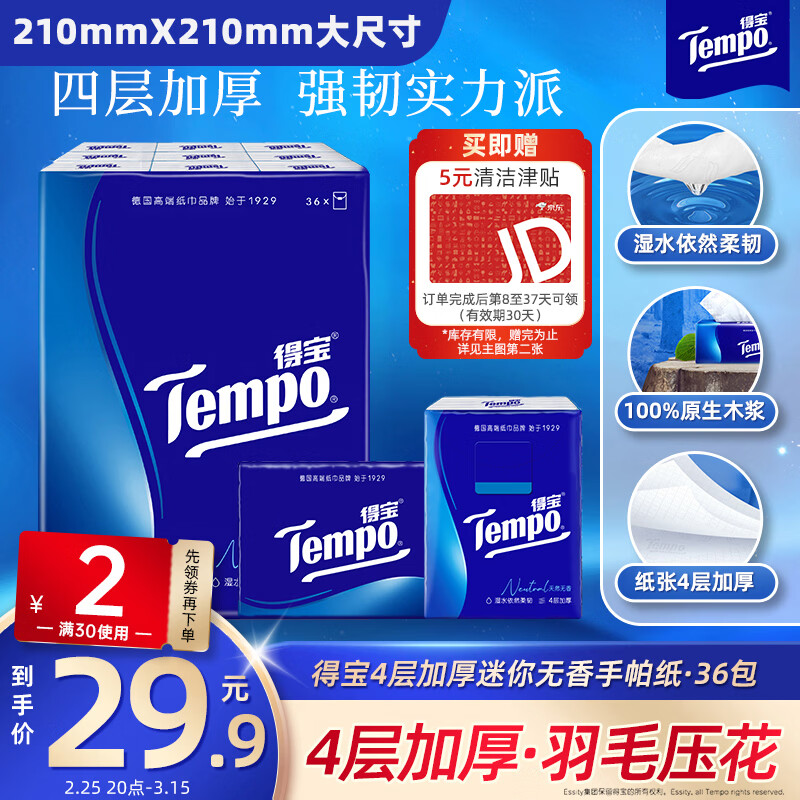 得宝(TEMPO)一博同款 手帕纸 经典无香4层7张*36包 湿水不破 纸巾小包 面巾纸