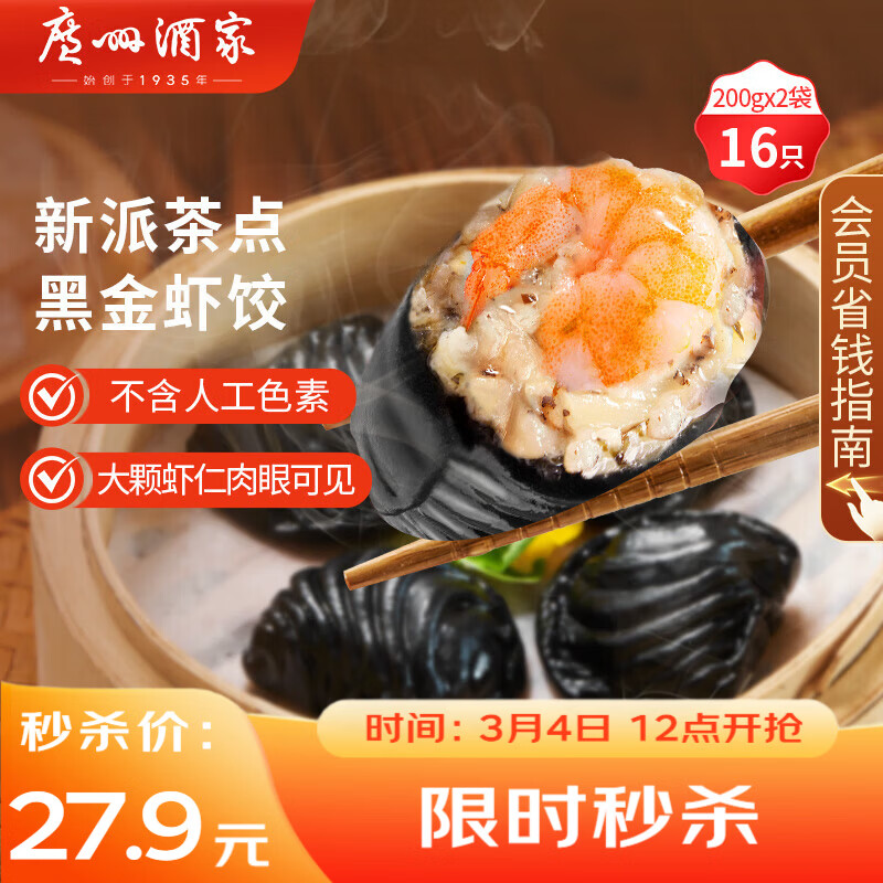 广州酒家黑金虾饺200g*2袋 16个 儿童早餐 早茶点心 速食面点速冻开学季