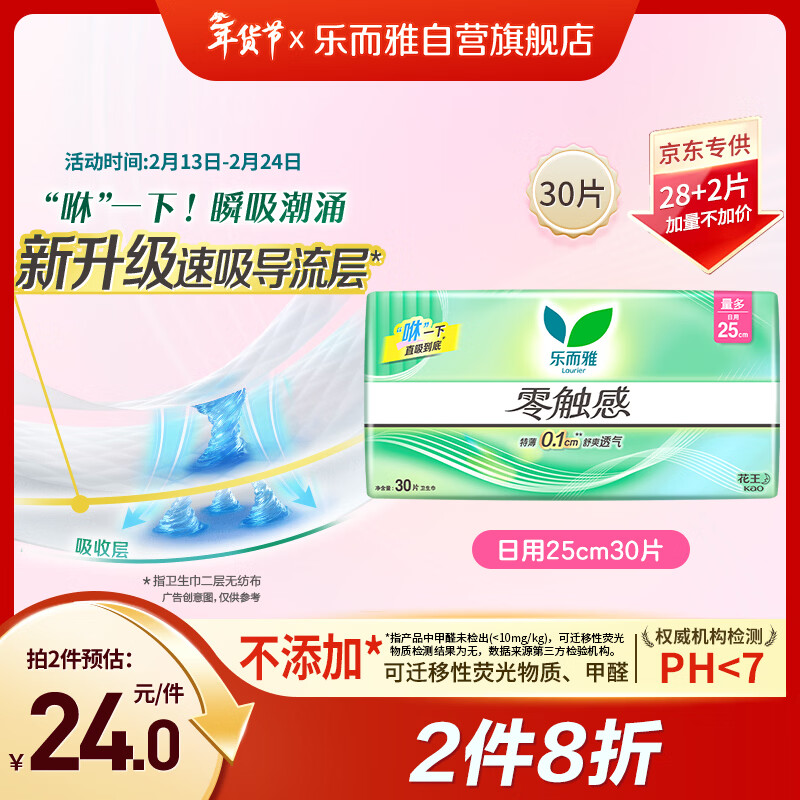 乐而雅花王零触感透气特长超丝薄日用护翼卫生巾25cm30片姨妈巾京东自营
