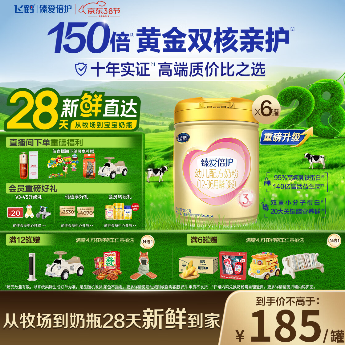 飞鹤臻爱倍护超级飞帆 婴幼儿配方奶粉3段(1-3岁)900g*6罐 28天新鲜