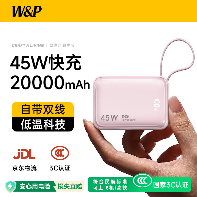 W&P新国标3C认证可上飞机45W充电宝20000毫安自带线大容量快充移动电源小巧便携适用苹果17小米华为wp