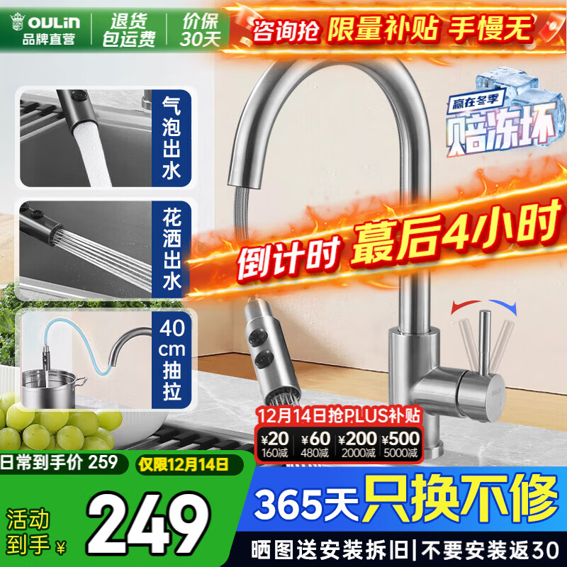 欧琳(OULIN)厨房水龙头304不锈钢抽拉式水龙头冷热洗菜盆龙头360双出水107