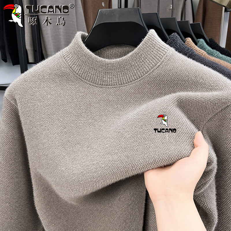 啄木鸟(TUCANO)毛衣男冬季半高领加绒加厚针织打底衫保暖一体绒衣服男装 卡其 XL