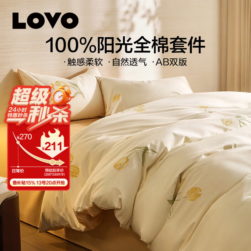 LOVO罗莱生活 100%纯棉四件套全棉超柔套件 床上用品单双人床单被套 【四季/全棉款】亭亭郁丽 1.5/1.8m 床单款 -被套200*230cm