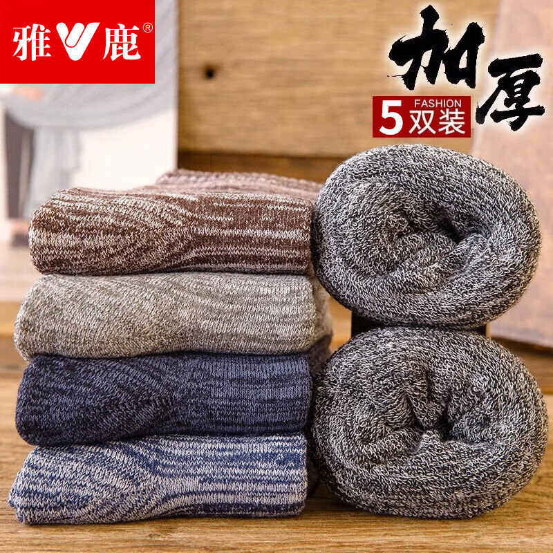 雅鹿保暖袜子男士中筒袜秋冬季加绒加厚毛圈袜潮流复古雪地袜 字母双色毛圈袜-随机 5双