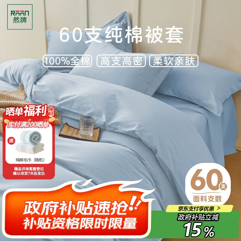 然牌60支纯棉被套单件 100%全棉被罩 1.5米床双人被罩180x200cm浅灰蓝