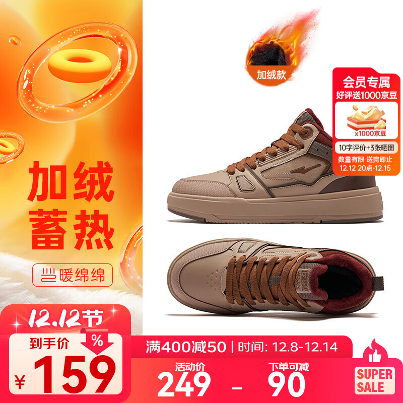 鸿星尔克男鞋高帮板鞋冬季新款厚底加绒棉鞋休闲鞋男子运动鞋子契约4.0 灰褐色/可乐棕 【加绒】 43