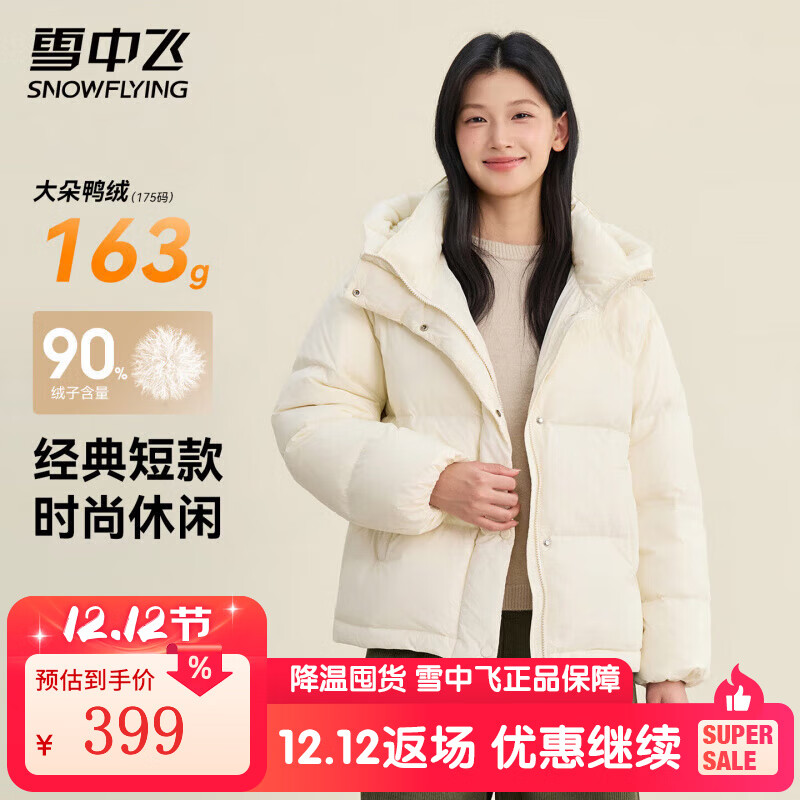 雪中飞抽绳连帽羽绒服女装冬季通勤居家百搭款鸭绒保暖松紧羽绒外套衣服 米白 L (165)