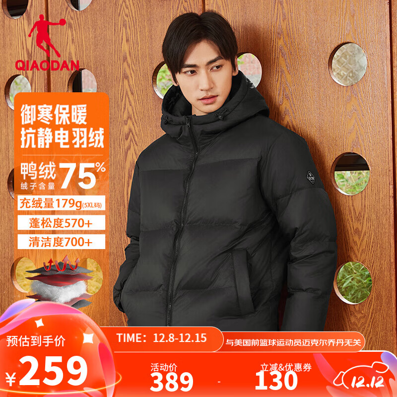 乔丹羽绒服男外套冬季保暖防寒防泼水连帽运动休闲夹克风衣 黑色 L 充绒量148g