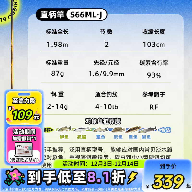 达亿瓦(DAIWA) 一击GL路亚竿 泛用微物虫竿雷强竿全环境通用进口鱼竿远投竿碳素 1.98m 2代-S66ML(2节中软调直柄) 不支持使用/试用后退换货
