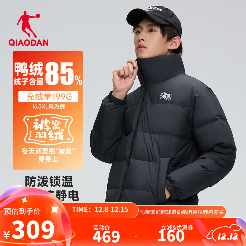 乔丹被窝羽绒服男外套秋冬季保暖防寒防泼水防风立领运动休闲上衣 黑色 L
