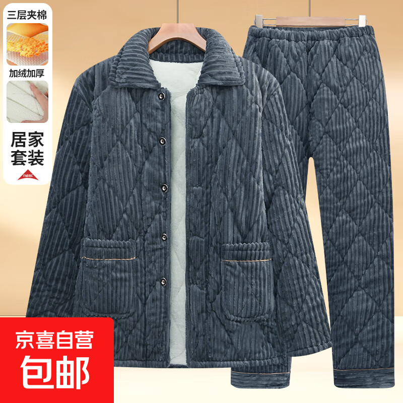 中老年珊瑚绒睡衣三层加厚夹棉加绒保暖服东北男士家居服爸爸棉袄 深灰色套装 5XL 推荐180-200斤