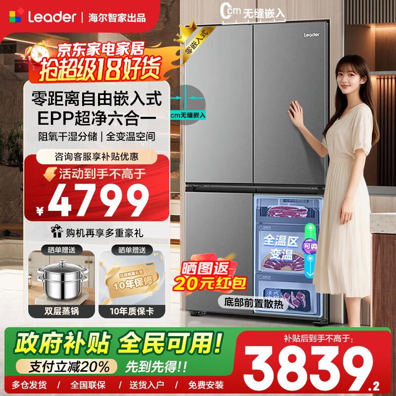 海尔出品冰箱540升冰箱零嵌入式四开门双开门十字对开门一级能效双变频超薄家用大容量Leader旗舰 零距离嵌入+阻氧干湿分储+EPP超净+全温区变温