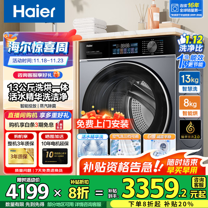 海尔【旗舰新品】13公斤滚筒洗衣机大容量全自动洗衣机家用超薄大筒径智能投放 变频一级能效 国家补贴 13公斤洗烘一体+活水精华洗+1.12洗净比