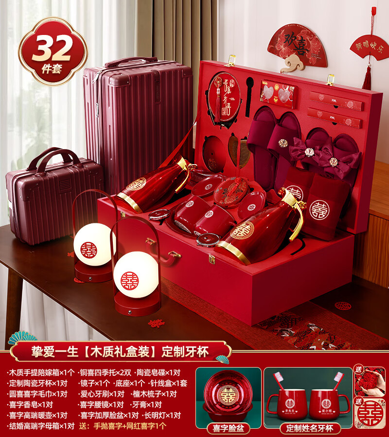 嘻吻乐长明灯陪嫁物品女方全套一整套行李箱子高档嫁妆套装结婚用品大全 挚爱一生32件套 子母箱+长明灯 无规格