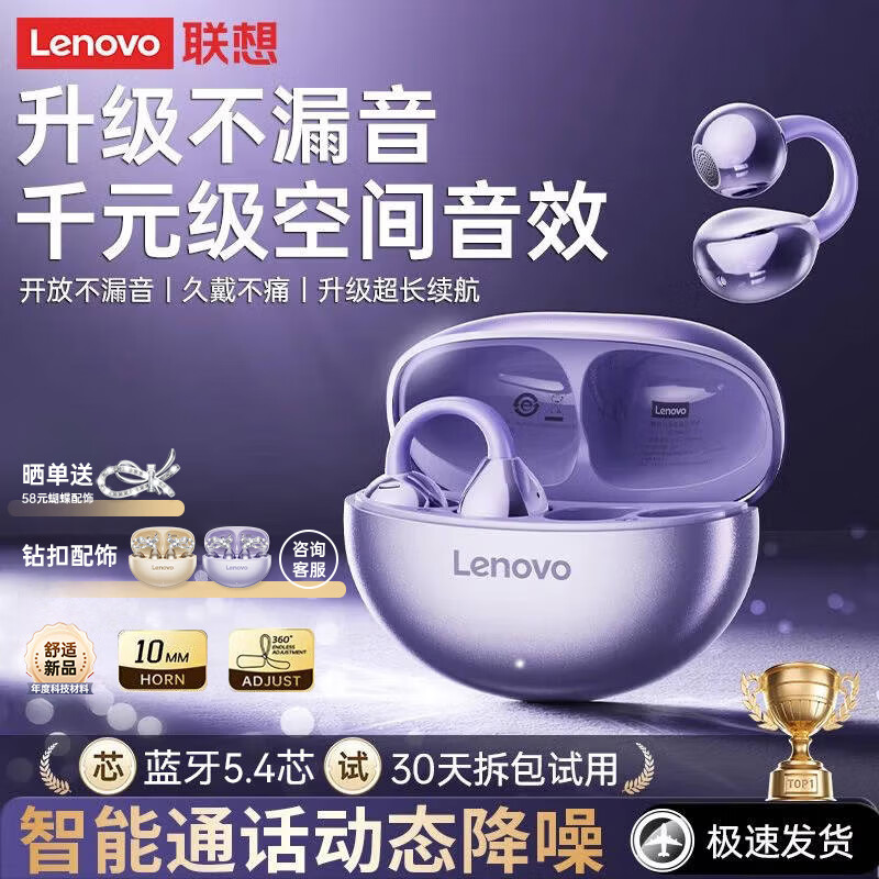 联想(lenovo)骨传导概念蓝牙耳机耳夹开放式无线不入耳蓝牙5.4耳机运动跑步通话降噪苹果小米通用TA410琉纡紫