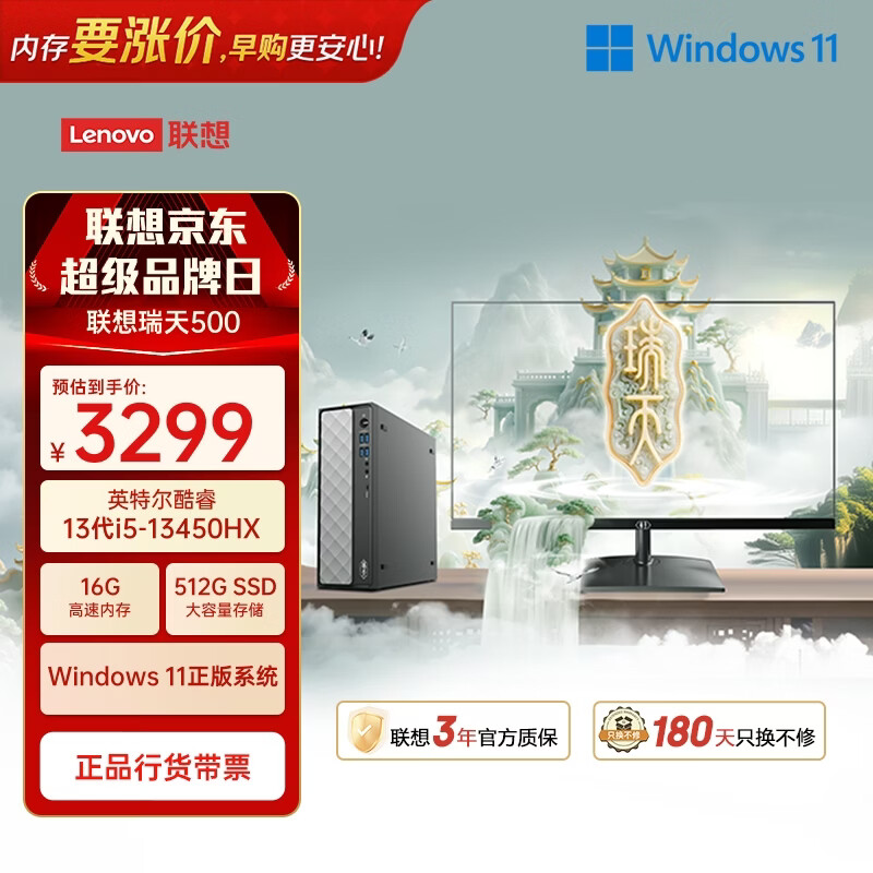 联想瑞天500 商用办公台式电脑台式机主机(酷睿13代i5-13450HX 16G 512G)21.5英寸 国家补贴