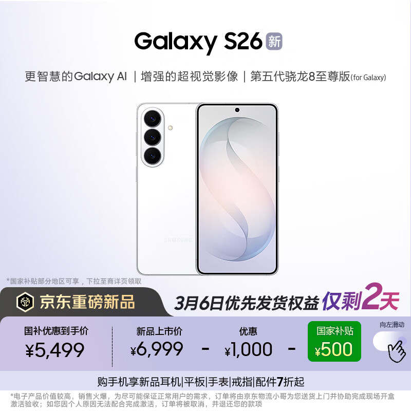 三星Galaxy S26 AI手机 超清夜间拍摄 IP68 第五代骁龙8至尊版 游戏手机 国家补贴 12+256GB 映雪白