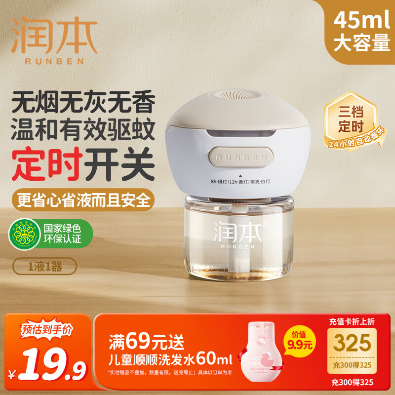 润本蚊香液电蚊香液驱蚊液45ml*1瓶+1个定时加热器驱蚊防蚊蚊香无香型