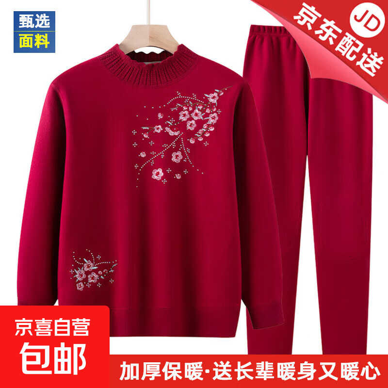 奶奶秋冬加绒保暖内衣两件套妈妈加厚毛衣套装中老年本命年红色 红色 4XL (建议130-145斤)