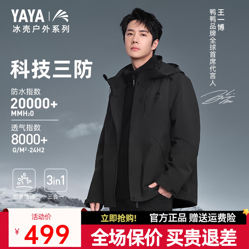 鸭鸭(YAYA)冰壳系列冲锋衣羽绒服男女短款2025冬季新款三合一连帽保暖外套HY 青光黑色YE4B016896A XL /180