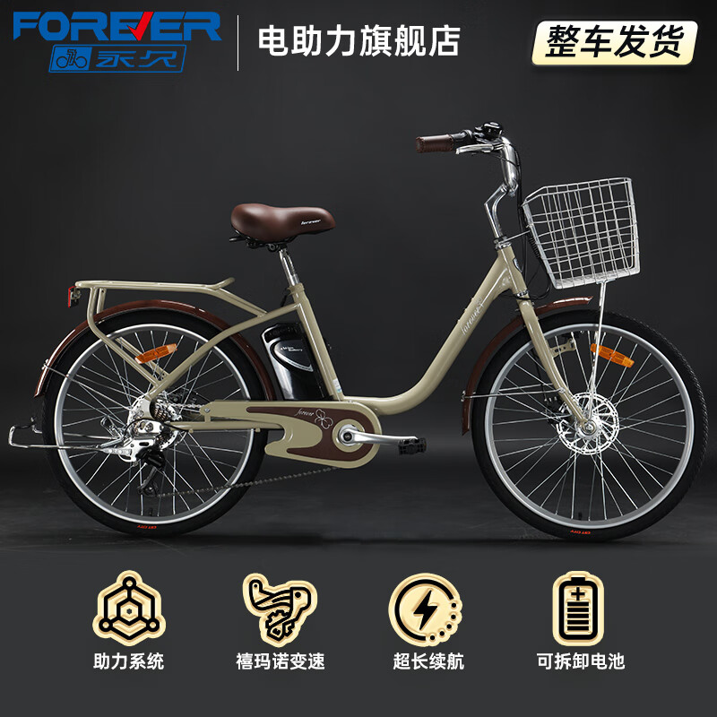 永久(FOREVER)锂电池助力电动自行车女式变速轻便舒适单车复古英伦城市通勤车 F56小米 开米士黄/24寸 10AH