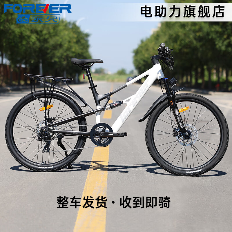 永久(FOREVER)锂电池助力山地车成人男女士碟刹变速软尾双减震学生电动自行车 F65XT600熊猫色(10AH油碟力矩版) 27.5英寸