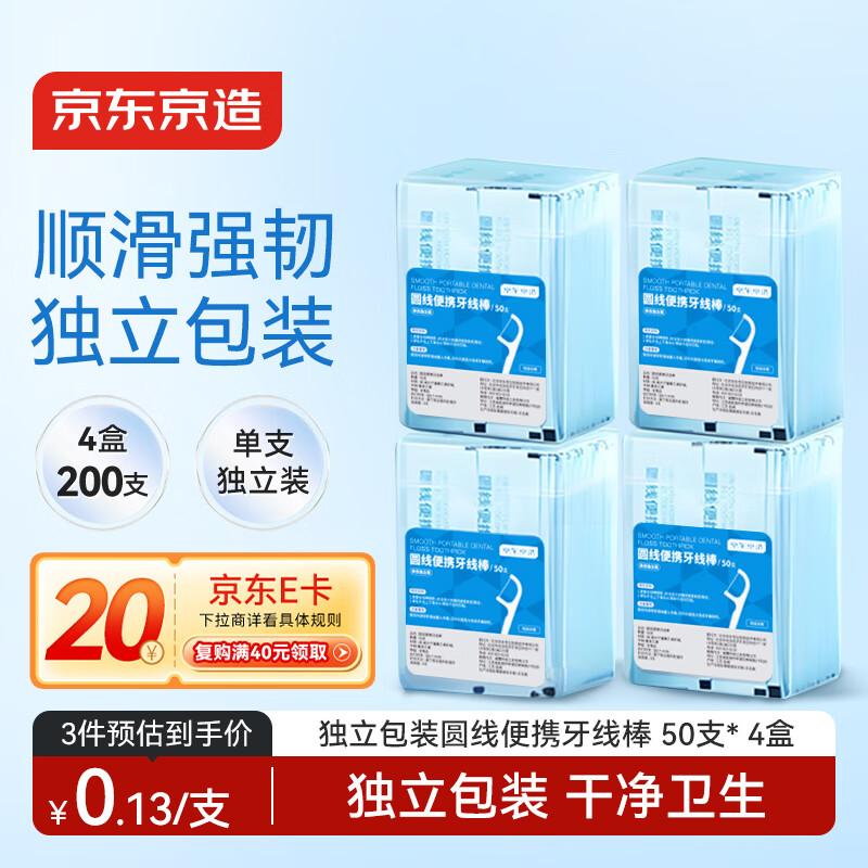 京东京造圆线便携牙线棒50支*4盒细滑牙线棒 独立包装清洁齿缝牙签单线