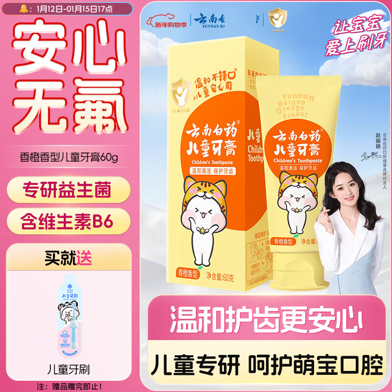 云南白药3-6岁儿童牙膏香橙味60g益生菌清新口气无氟洁齿温和护口