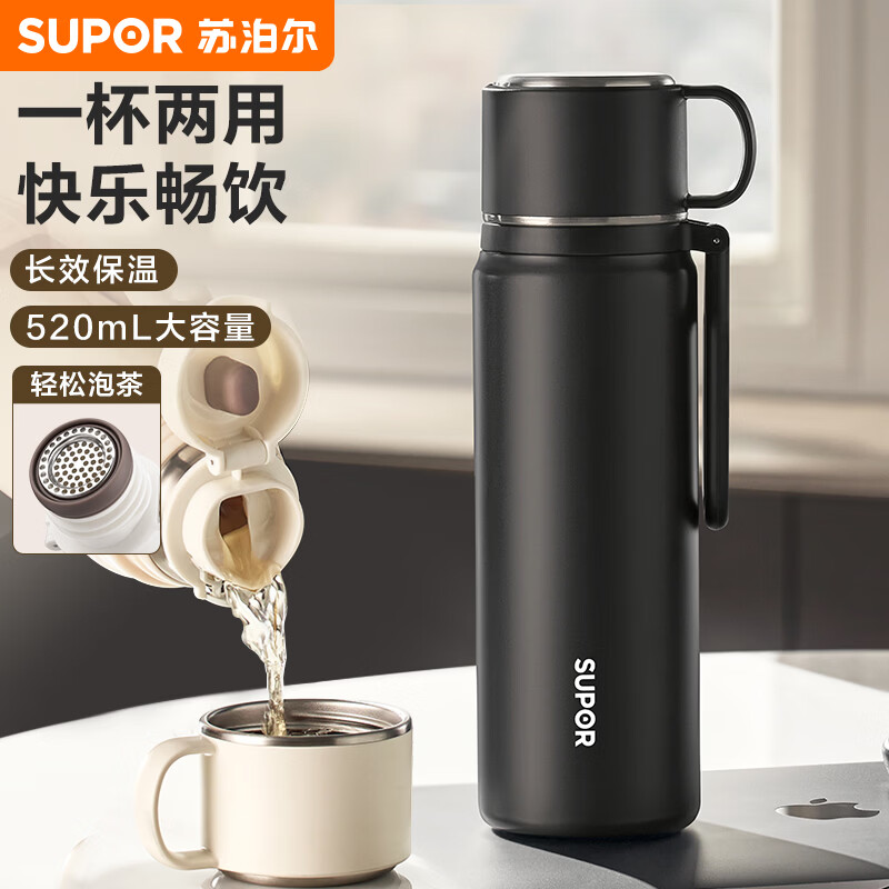 苏泊尔(SUPOR)保温杯316L不锈钢保温水杯子便携男女士学生大容量 黑【316L内胆+杯盖带把手】520mL